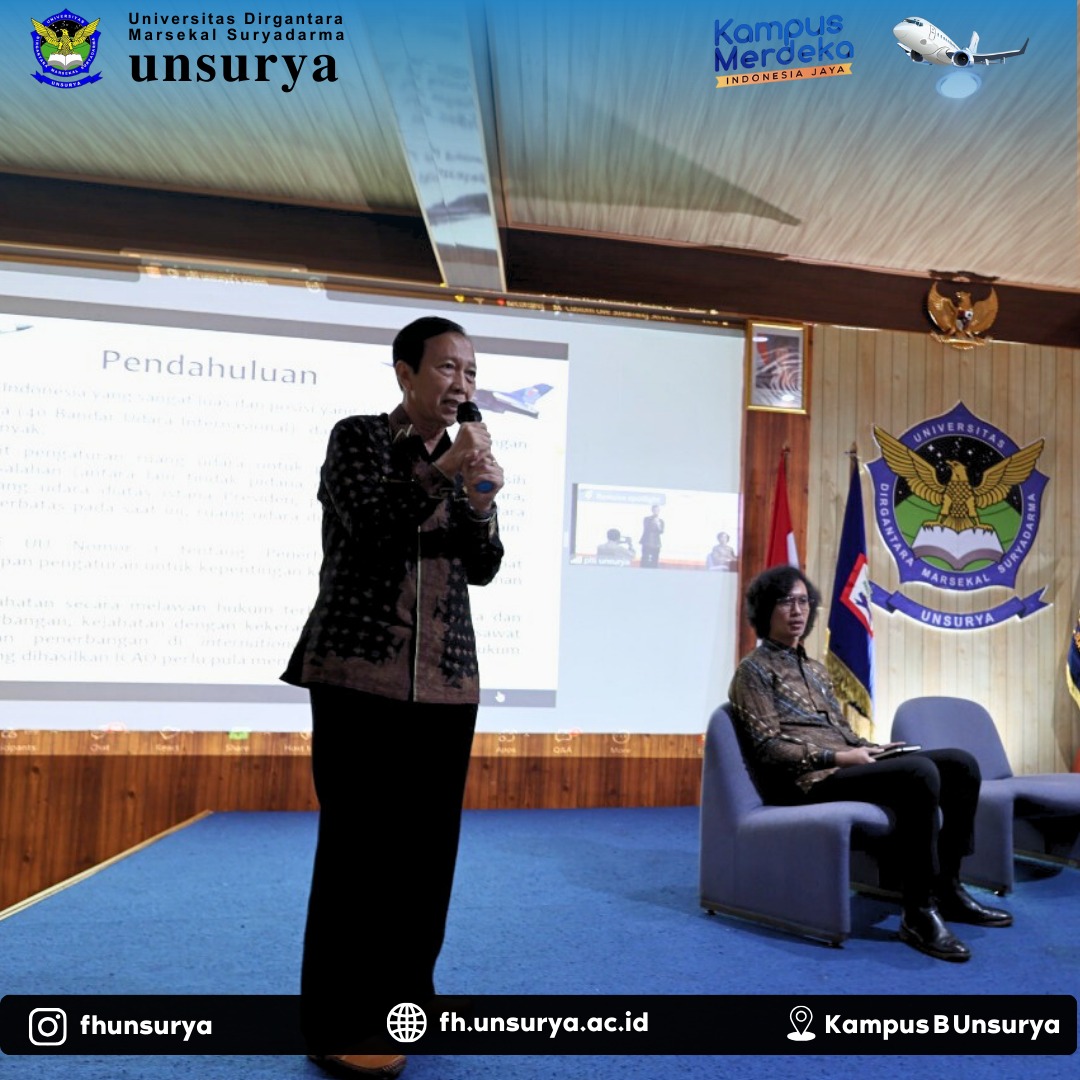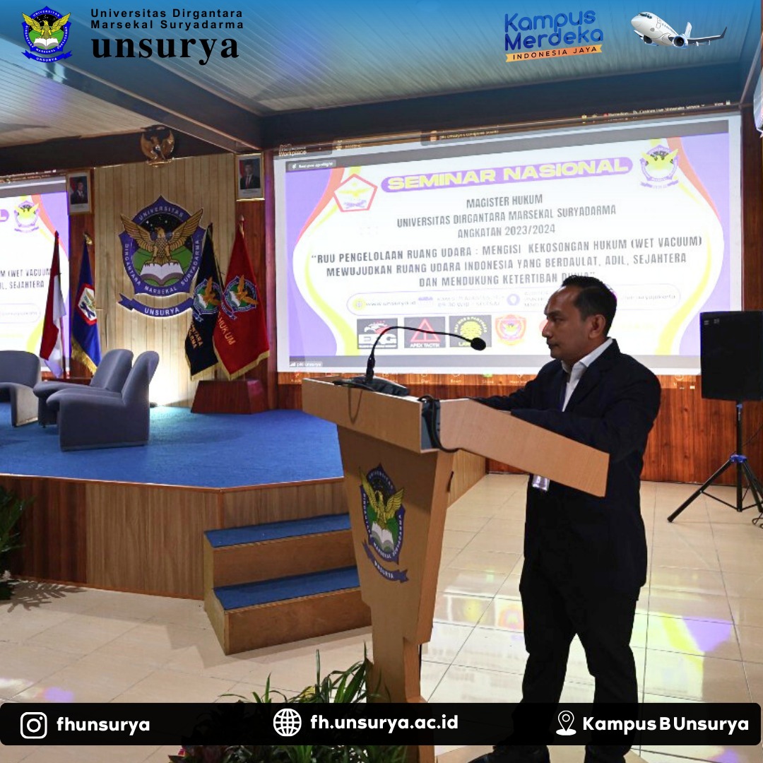 Pada Kamis, 21 Agustus 2025 Mahasiswa Magister Hukum Fakultas Hukum Universitas Dirgantara Marsekal Suryadarma (MH Unsurya) Angkatan 2023/2024 telah sukses menyelenggarakan seminar Nasional Magister Hukum Universitas Dirgantara Marsekal Suryadarma (Unsurya) Dengan tema “RUU Pengelolaan Ruang Udara: Mengisi Kekosongan Hukum (Wet Vacuum), Mewujudkan Ruang Udara Indonesia yang Berdaulat, Adil, dan Mendukung Ketertiban Dunia”, seminar ini menjadi wujud visi Unsurya yang mengedepankan keilmuan hukum kedirgantaraan.