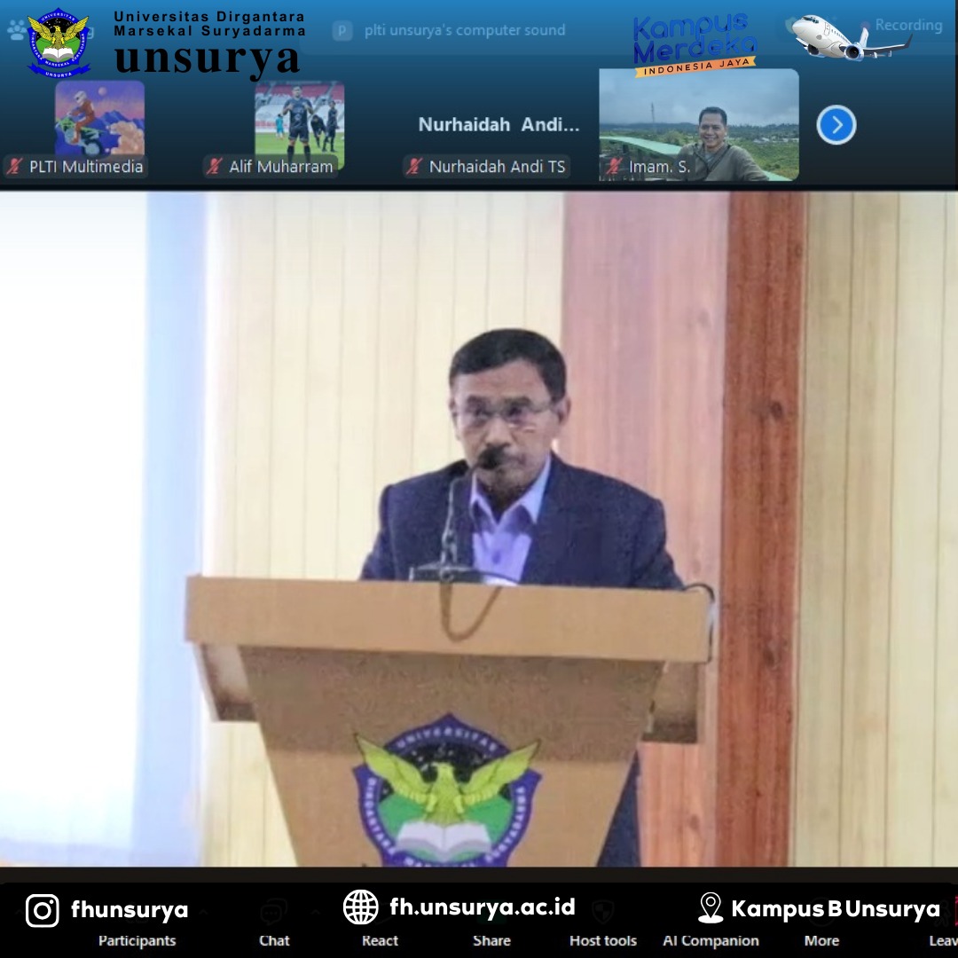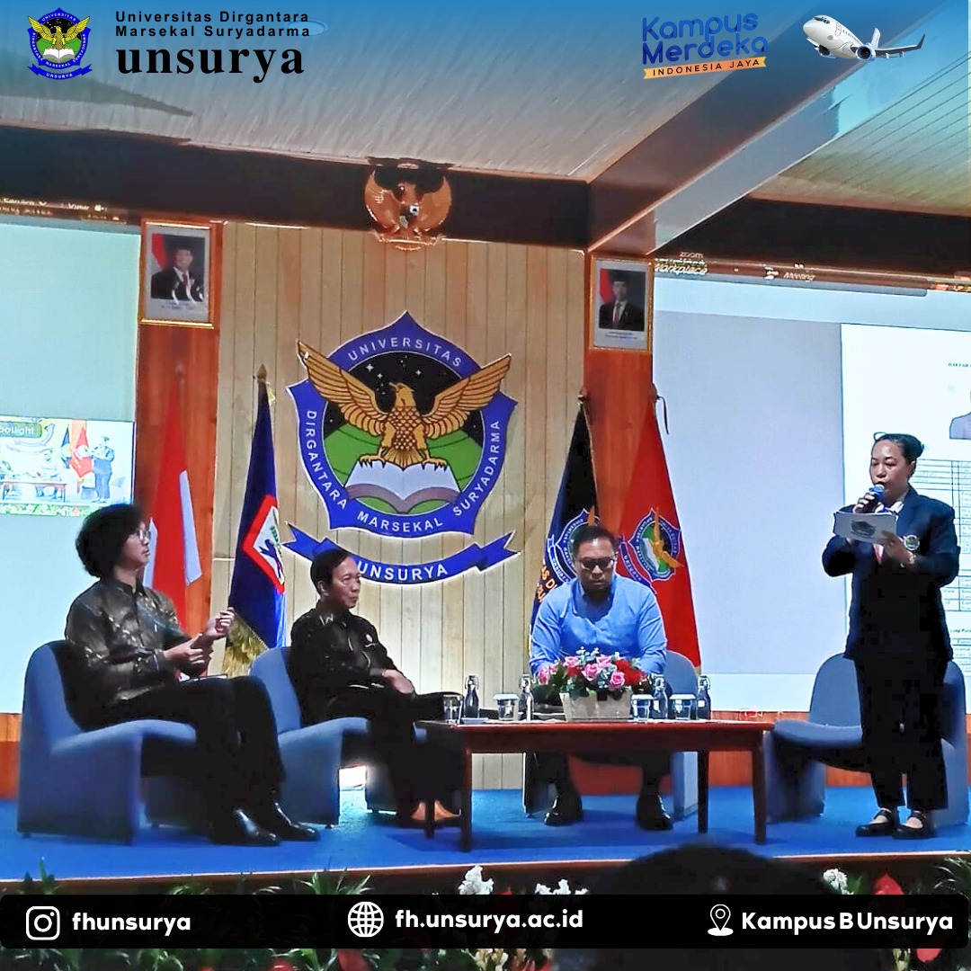 Narasumber utama yaitu Prof. Hikmahanto Juwana, S.H., LL.M., Ph.D. (Guru Besar Hukum Internasional UI), Dr. Bambang Widarto (Kaprodi MH Unsurya), dan Ridha Aditya Nugraha, LL.M. (Pejabat Dekan Sekolah Hukum dan Studi Internasional Universitas Prasetiya Mulya), dengan moderator Sry Karni Noviyanti, S.Sos (Mahasiswa MH Unsurya).